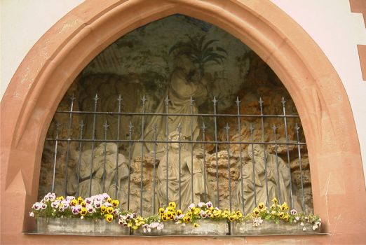 Vor der Pfarrkirche befindet sich eine Ölberg-Darstellung von 1497 aus der Riemenschneider-Schule Spitzer mit gekehltem Öffnungsbogen und sich überschneidenden Stäben. Am Scheitel findet sich die Jahreszahl 1497. Dem Betrachter zeigt sich ein Kreuzgewölbe mit Tartschenschild im Schluss. Lebensgroße Sandsteinfiguren des Heilands mit den drei Jüngern, Judas und den Schächern bilden den Hintergrund. | |
