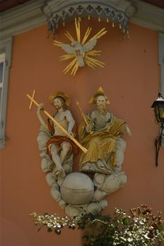 Im gesamten Altortsbereich befindet sich eine Vielzahl von Heiligenfiguren an den Aussenfassaden der Gebäude. Zu den schönsten Figuren zählt die Dreifaltigkeit, die 1763 vom Kitzinger Bildhauer Reiner Wirl geschnitzt wurde. |