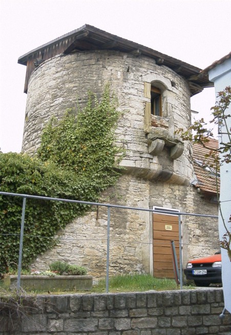 Als die Dorfmauer ihre Schutzfunktion zu Beginn des 19. Jh. verlor, wurde sie teilweise bebaut. Die Türme konnten von der Gemeinde erworben werden und wurden in das Haus integriert. Hier diente das Untergeschoss des Turmes als Kuhstall. Baumaterialien für die Gebäude besorgte man sich übrigens meist dadurch, indem man die Wehrmauer einfach teilweise abtrug. |